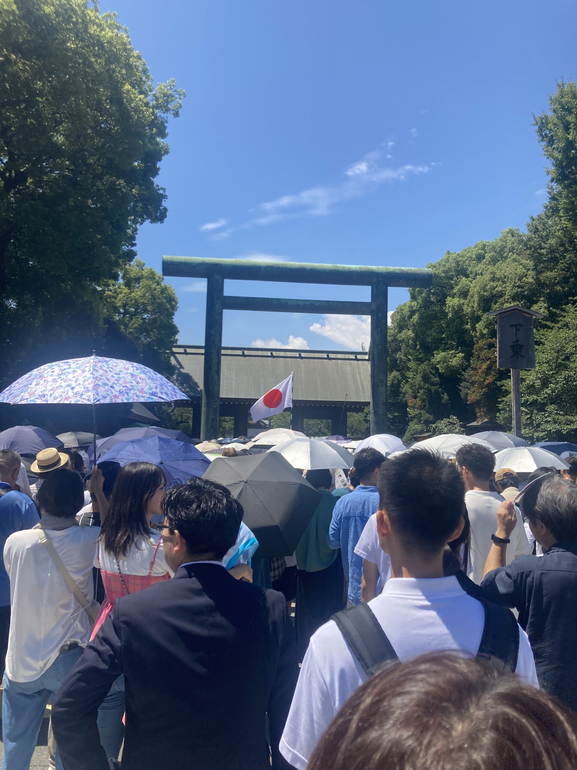 友人と正午に待ち合わせをしていたが、ものすごい人の数。九段下の地下鉄の駅を上った瞬間身動きが出来ないほどであった。スマホでのやりとりで友人と会うことが出来(便利な世の中になったね)、混雑の中第二鳥居まで行ったが、なんとそこから参拝まで二時間かかるとのこと!! この気温で二時間は老体には危険と判断し、迂回して北門から入り、途中正午になり一分間の黙祷の後、正式な列のトップの横までたどり着いて、斜めからだったがそこで参拝した。賽銭無しで、それも正面ではない参拝も初めてだったが、しょうがない。無理をしないことと心に言いきかせた。