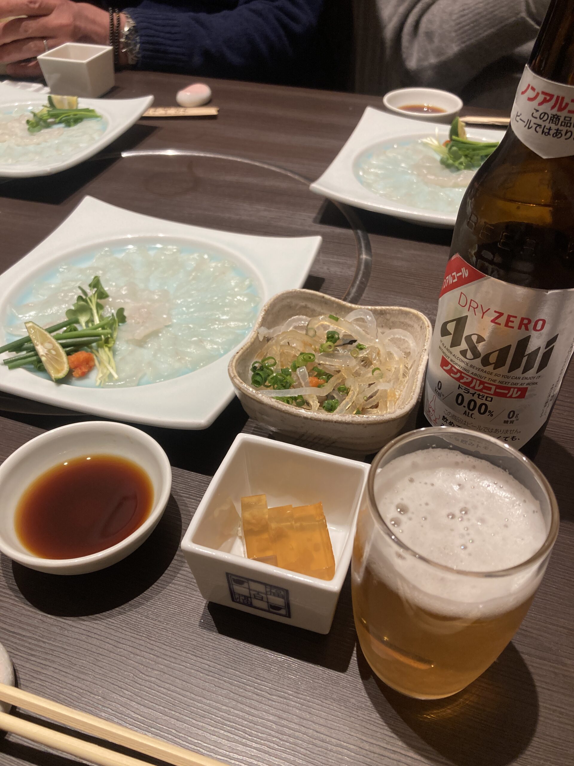 午後6時から新年会。気の合った4人で、12年前からP会として、2·3か月に一回ぐらいのペースで集まっている。今回は新年会だし、冬の味覚「ふぐ」を食べようということになった。ただ痛風の事を考え、当然ノンアルコールにする。実際この一週間アルコールを口にしていない。しかし、せっかくのふぐ料理にノンアルとはなぁ。泣けてくる。だがさすがに我慢出来ず、ひれ酒を二口だけ。ふぐにはやはりひれ酒。香ばしい香りが鼻に抜けて、ん~っ、旨い!!!